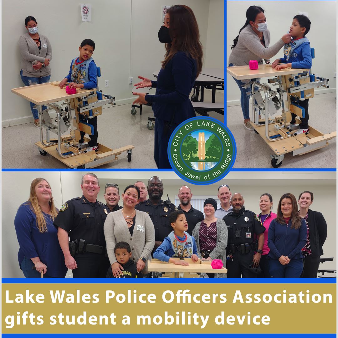 Jordan Colon, a student at Victory Ridge Academy in Lake Wales got a big surprise when City of Lake Wales police officers presented him with a Kaye Dynamic Stander, a multi-positional standing aid with 360 degrees of movement.