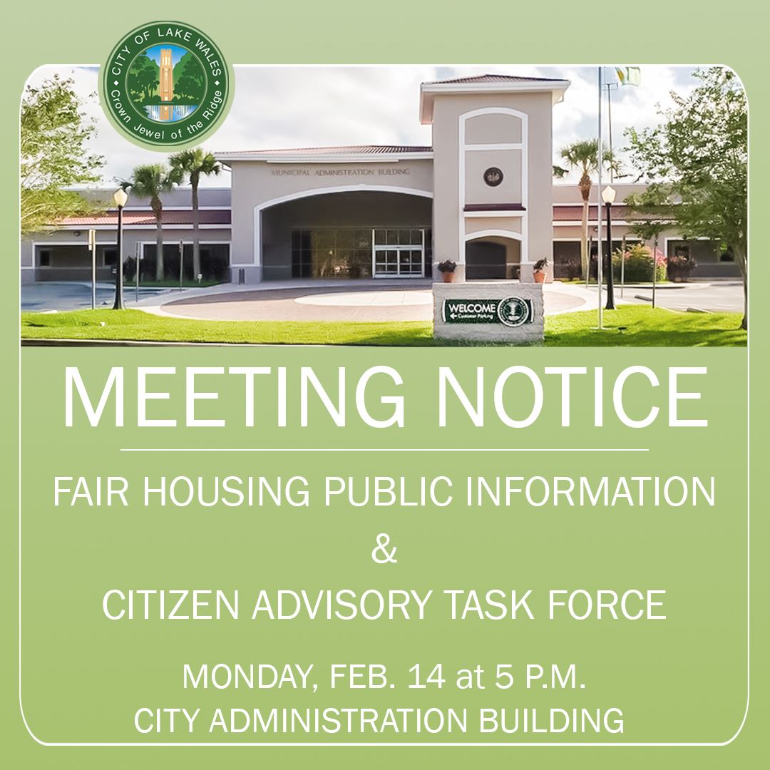 The City of Lake Wales will conduct a combined Fair Housing Public Information Meeting and Citizen Advisory Task Force meeting in the City Manager’s Conference Room at the City of Lake Wales Administration Building located at 201 Central Avenue West, Lake Wales, Florida 33859-1320 on Monday, February 14, 2022 at 5:00 p.m., or as soon thereafter as may be heard. The fair housing meeting is intended to provide the public, real estate professionals, and elected officials with information concerning fair housing requirements.