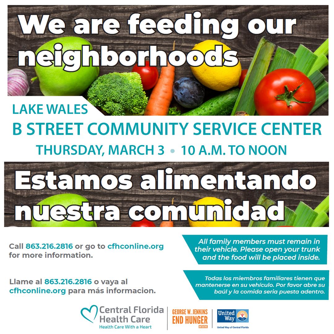 In collaboration with Central Health Care, United Way of Central Florida and the George W. Jenkins End Hunger Initiative, citizens may receive, twice a month, one week’s worth of food.