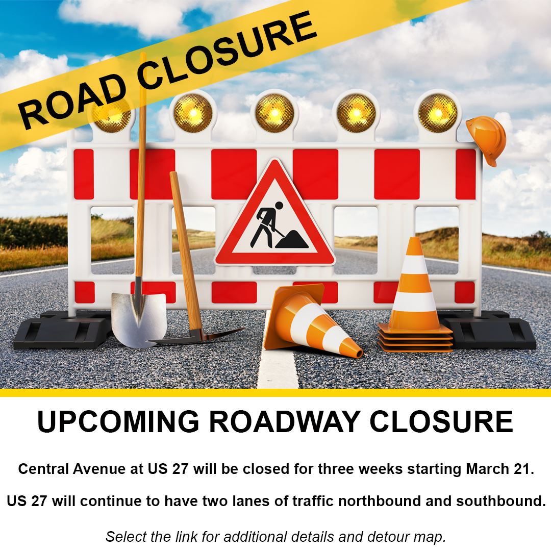 The US 27 at SR 60 project will have an upcoming roadway closure estimated to begin March 21, 2022. Central Avenue at US 27 will be closed at the intersection for approximately three weeks. US 27 will continue to have two lanes of traffic northbound and southbound. Movement in and out of Central Avenue west of US 27 will be closed. Movement in and out to Central Avenue east of US 27 will be open. The left turn lane on US 27 northbound to Central Avenue and the right turn lane on US 27 southbound to Central Avenue will be closed. The closure is to allow crews to construct concrete pavement in the western portion of the intersection.