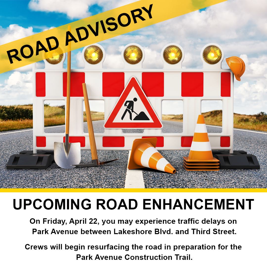 On Friday, April 22, you may experience traffic delays on Park Avenue between Lakeshore Blvd. and Third Street. Crews will begin resurfacing the road in preparation for the Park Avenue Construction Trail.
