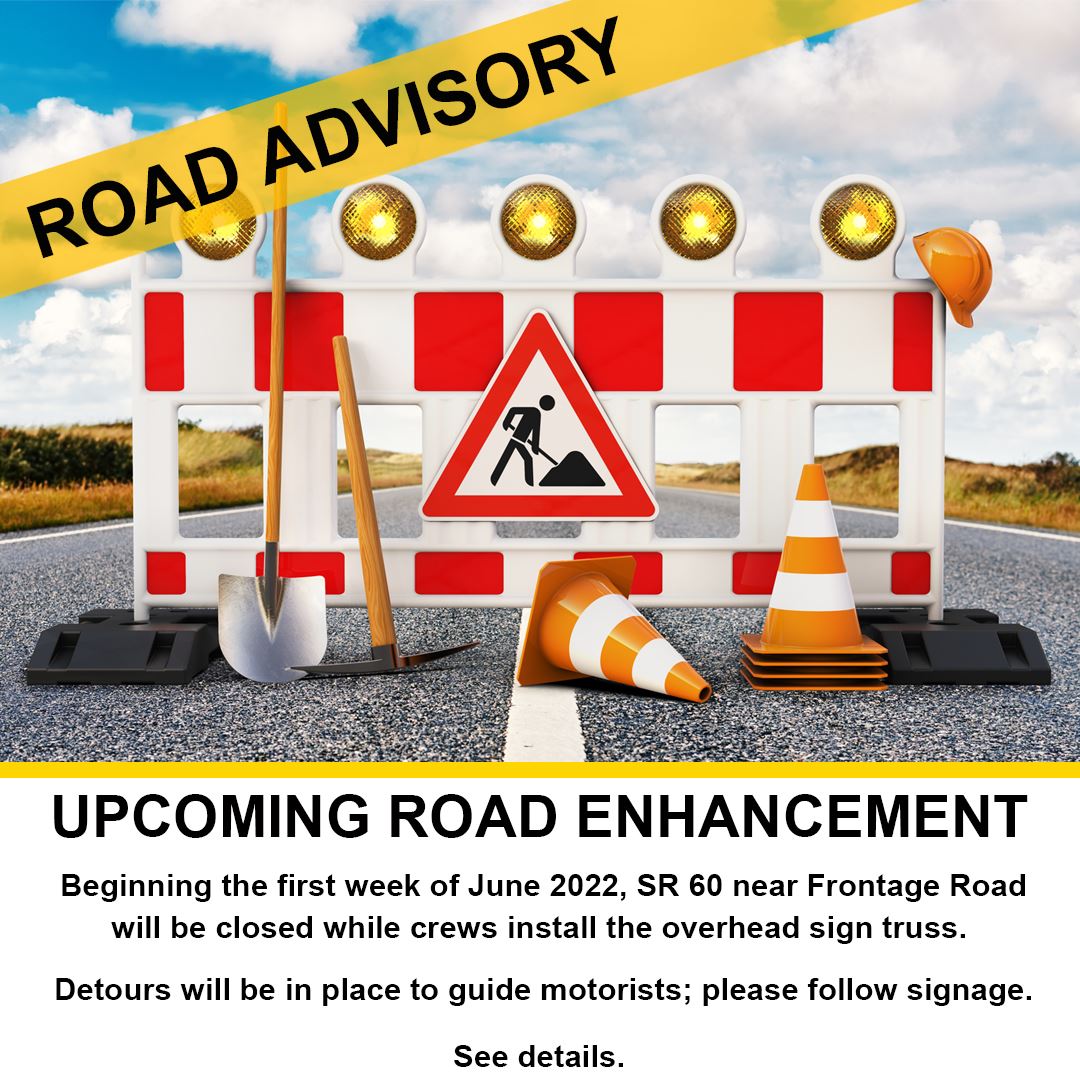 Beginning the first week of June 2022, SR 60 near Frontage Road will be closed while crews install the overhead sign truss. Detours will be in place to guide motorists; please follow signage. Please allow extra travel time and use caution in the area.