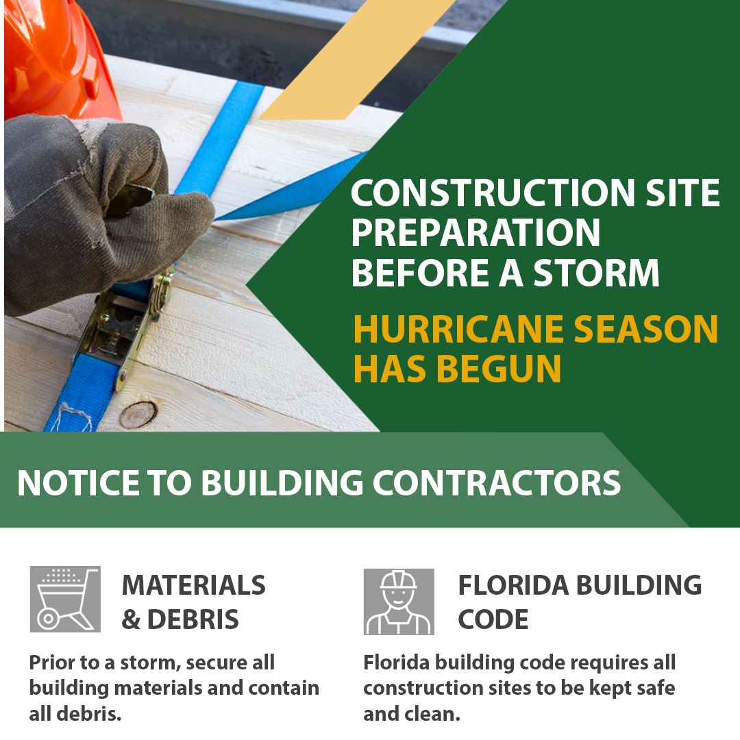 Florida Building Code requires all construction sites to be kept safe and clean. The City of Lake Wales’ staff reminds builders to have a plan in place prior to a storm. Secure all building materials and debris prior to a storm. These items may become projectiles during a storm. For more information on yard and construction site preparation before a storm and details related to tree removal, visit: https://www.lakewalesfl.gov/DocumentCenter/View/5391/Yard-Preparedness-Before-a-Storm?fbclid=IwAR2XxShAs6gHMvgBKPq-hQFL0NgAvOMqPJgrI2PVXEoCcXdZfUsvhYLlym0