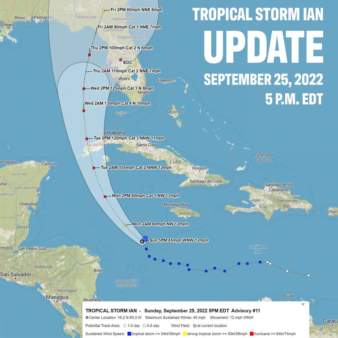 The center of Tropical Storm Ian was located near latitude 16.2 North, longitude 80.3 West. Ian is moving toward the west-northwest near 12 mph. A turn toward the northwest is expected tonight, followed by a north-northwestward motion on Monday and a northward motion on Tuesday with a slightly slower forward speed. On the forecast track, the center of Ian is expected to pass near or west of the Cayman Islands on Monday, and near or over western Cuba Monday night and early Tuesday. Ian will then emerge over the southeastern Gulf of Mexico on Tuesday. Maximum sustained winds are near 45 mph with higher gusts. Some strengthening is forecast tonight, followed by more rapid strengthening on Monday and Tuesday. Ian is forecast to become a hurricane on Monday and a major hurricane on Tuesday. Tropical-storm-force winds extend outward up to 35 miles from the center. The estimated minimum central pressure is 1003 mb.