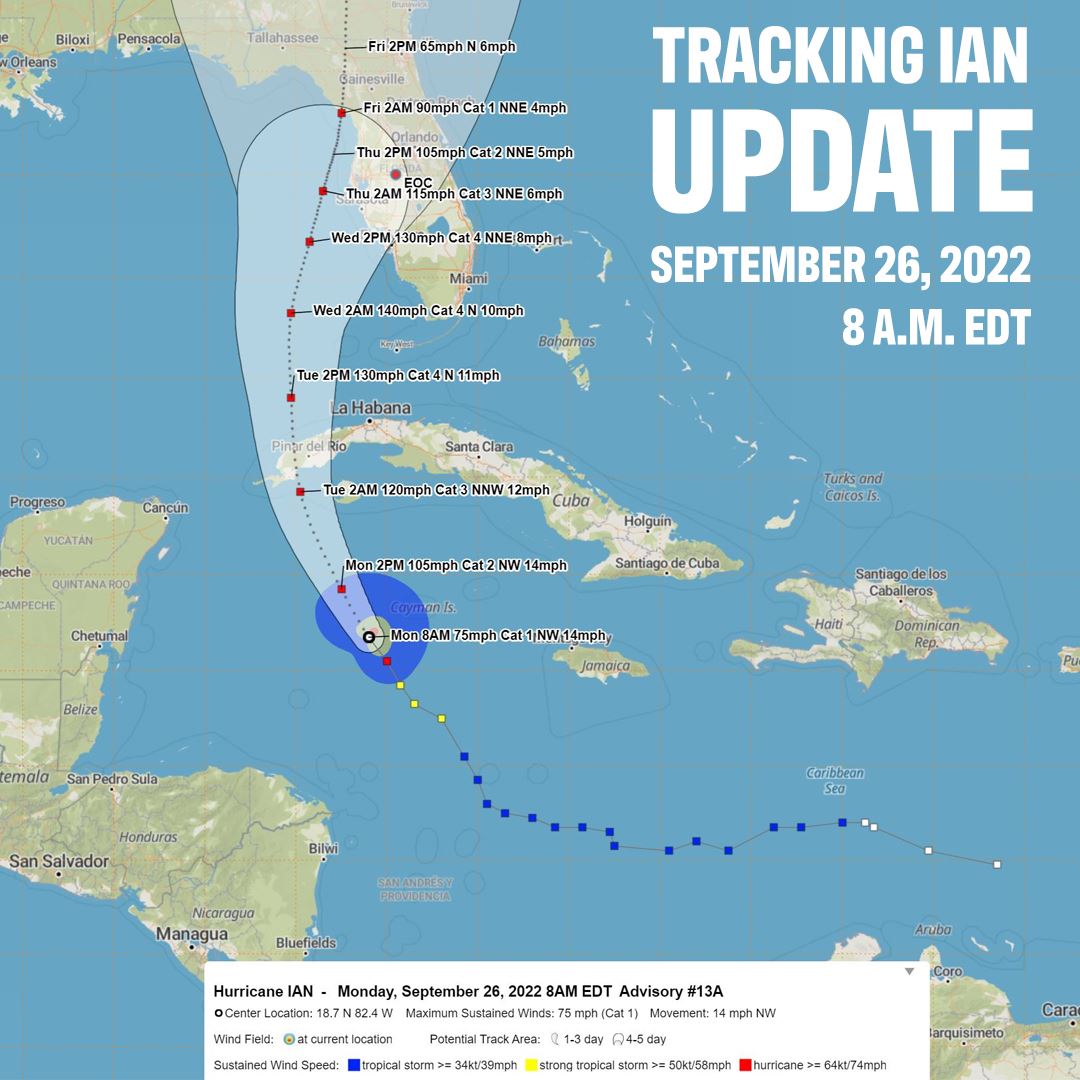 Update on Hurricane Ian as of 8 a.m. on September 26, 2022. The center of Hurricane Ian was located near latitude 18.7 North, longitude 82.4 West. Ian is moving toward the northwest near 14 mph. A turn toward the north-northwest is expected later today, followed by a northward motion on Tuesday with a slightly slower forward speed. A turn toward the north-northeast is forecast on Tuesday night or early Wednesday. On the forecast track, the center of Ian is expected to pass near or west of the Cayman Islands today, and near or over western Cuba tonight and early Tuesday. Ian will then emerge over the southeastern Gulf of Mexico on Tuesday, pass west of the Florida Keys late Tuesday, and approach the west coast of Florida on Wednesday. Maximum sustained winds are near 75 mph with higher gusts. Rapid strengthening is expected during the next day or so, and Ian is forecast to become a major hurricane tonight when it is near western Cuba. Hurricane-force winds extend outward up to 15 miles (30 km) from the center and tropical-storm-force winds extend outward up to 90 miles (150 km). The estimated minimum central pressure is 981 mb (28.97 inches) based on dropsonde data from the NOAA and Air Force Hurricane Hunters.