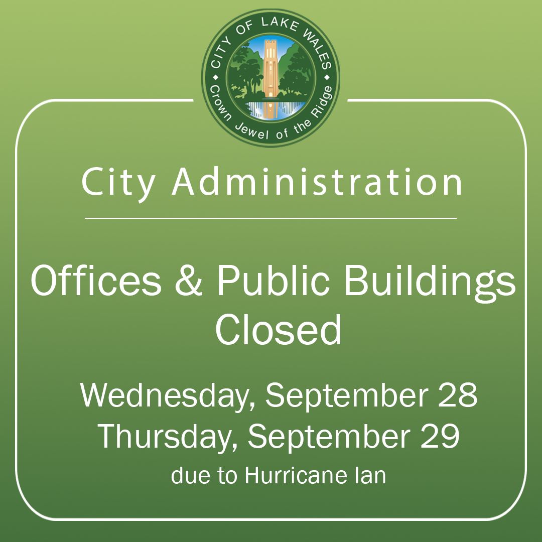 City offices and public buildings will be closed due to Hurricane Ian, starting Wednesday, September 28 through Thursday, September 29. City staff will be monitoring the storm and release updates on the City's website and social media platforms.