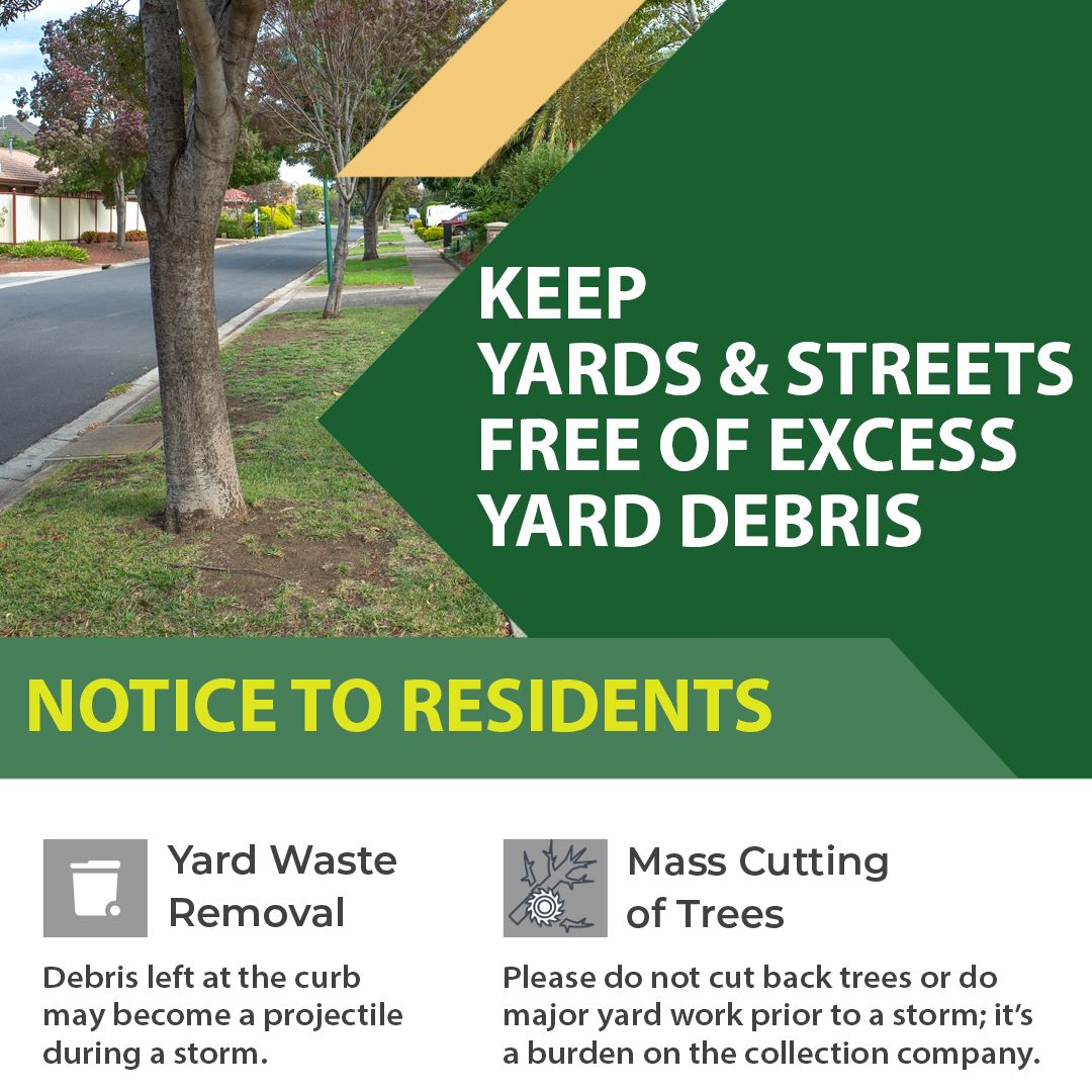 Prior to Hurricane Ian, it's important to keep yards and streets free of excess tree limbs, branches and yard debris. These items may become projectiles during the storm. Please do not cut back trees or do major yard work prior to  the hurricane; it's a burden on the collection company.