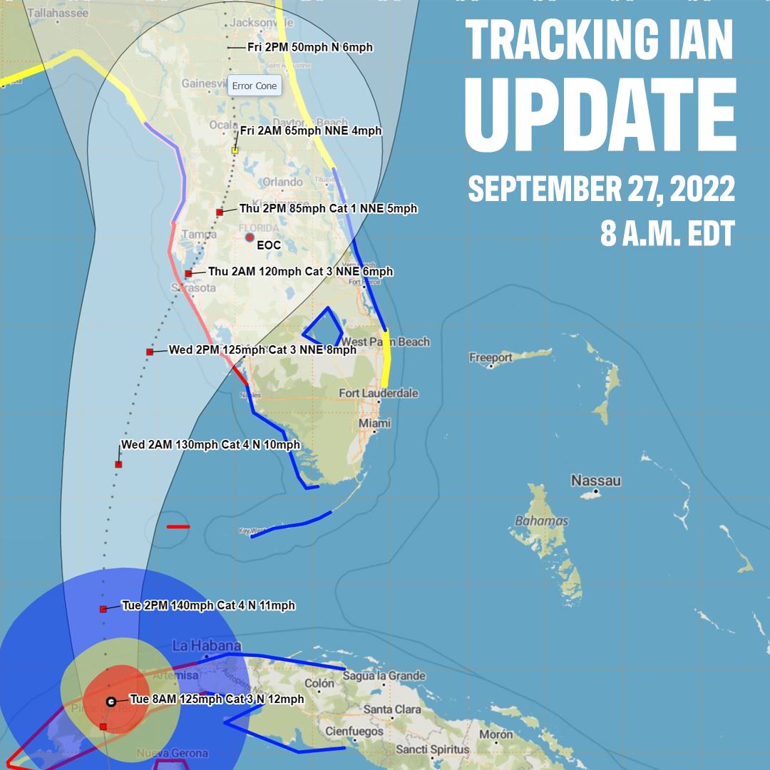 Update on Hurricane Ian as of 8 a.m. on Tuesday, September 27. The center of Hurricane Ian was located by NOAA Hurricane Hunter aircraft, Cuban and Key West radar data near latitude 22.6 North, longitude 83.6 West. Ian is moving toward the north near 12 mph (19 km/h), and this motion is expected to continue today. A turn toward the north-northeast with a reduction in forward speed is forecast tonight and Wednesday. On the forecast track, the center of Ian is expected to emerge over the southeastern Gulf of Mexico in a couple of hours, pass west of the Florida Keys