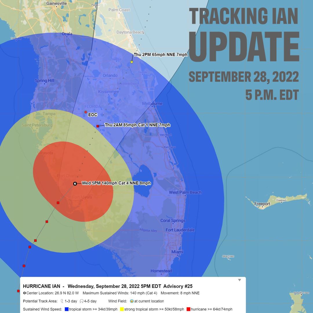 Update on Hurricane Ian as of 5 p.m. on Wednesday, September 28. The eye of Hurricane Ian was located near latitude 26.9 North, longitude 82.0 West. Ian is moving toward the north-northeast near 8 mph (13 km/h). On the forecast track, the center of Ian is expected to move across central Florida tonight and Thursday morning and emerge over the western Atlantic by late Thursday. Ian is forecast to turn northward on Friday and approach the northeastern Florida coast, Georgia and South Carolina coasts late Friday.