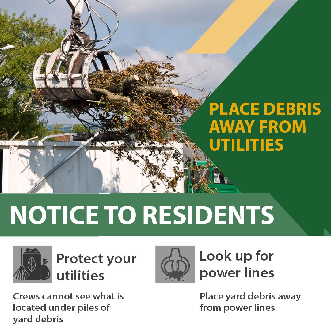 As crews continue collecting yard debris, please ensure the debris is away from storm inlets and utilities, such as water meters and cable boxes. Crews cannot see what lies beneath piles of yard debris. The claw on the utility service vehicle is powerful and may damage what lies beneath the debris. Also, look up and check for low-hanging power lines. The claw needs sufficient room to remove the debris.