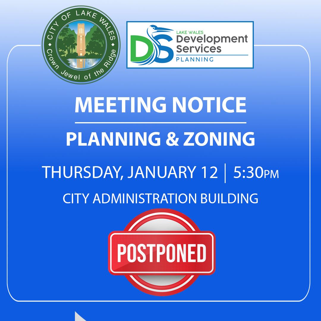 The Planning & Zoning meeting scheduled for Thursday, January 12 at 5:30 p.m. has been postponed. We will update everyone when the new meeting date becomes available. The agenda is available at this link: https://www.lakewalesfl.gov/AgendaCenter/ViewFile/Agenda/_01122023-1231