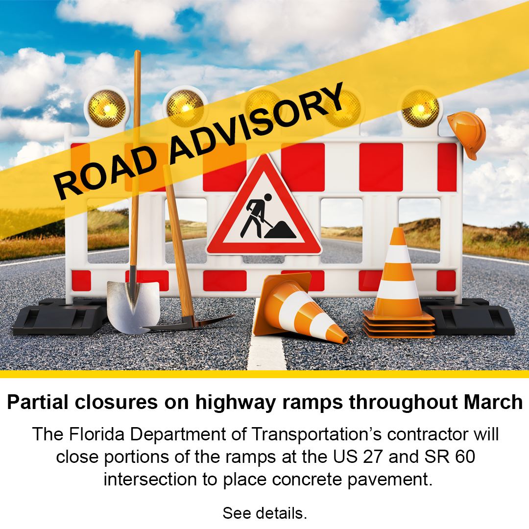 On Friday, March 10, 2023, the Florida Department of Transportation’s contractor will close portions of the ramps at the US 27 and SR 60 intersection to place concrete pavement. Access to US 27 from SR 60 and from SR 60 to US 27 will be maintained with right turns and U-turns. SR 60 eastbound to US 27 northbound will turn right at the end of the ramp then U-turn on US 27. SR 60 westbound to US 27 southbound will turn right at the end of the ramp and U-turn on US 27. US 27 southbound to SR 60 eastbound will travel south of the interchange, U-turn on US 27, then use the northbound exit from US 27 to eastbound SR 60. Northbound US 27 to westbound SR 60 will travel north of the interchange then turn left on Central Avenue to westbound SR 60. The partial ramp closures will be from 7 p.m. Friday, until 5 a.m., Monday. These partial ramp closures will take place for two consecutive weekends. The same partial ramp closures will occur again on Friday, March 17 through Monday, March 20. Signage will direct motorists to the detours. Law Enforcement will be on site to assist motorists. Please allow extra travel time and use caution in the construction zones.