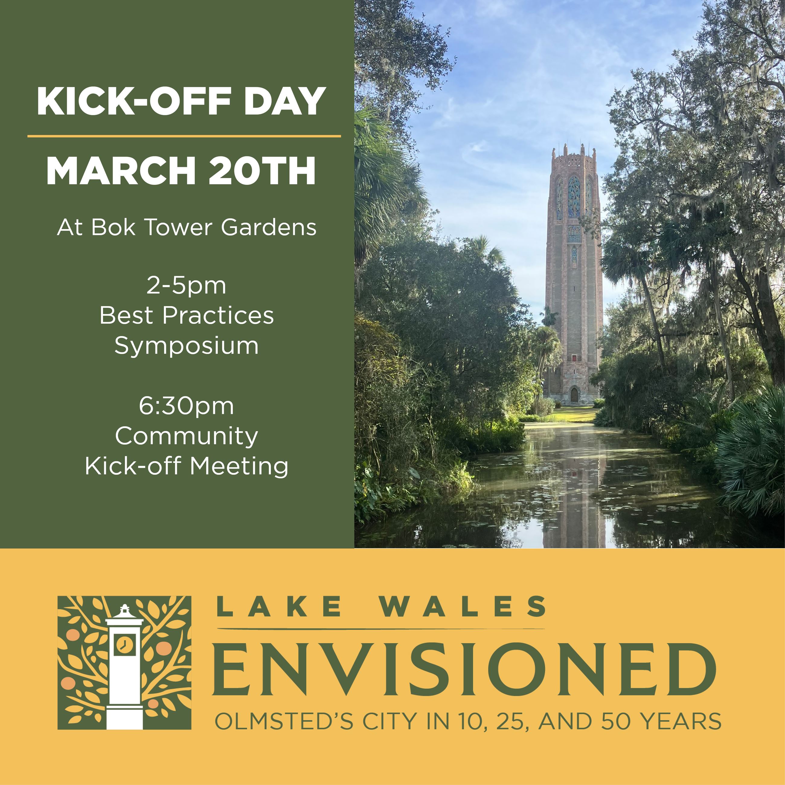 We have a great day planned for the Kick-off of Lake Wales Envisioned on March 20th! Not able to attend the Best Practices Symposium? Come for a summary and conversation with your neighbors at the Community Kick-off Meeting at 6:30pm!