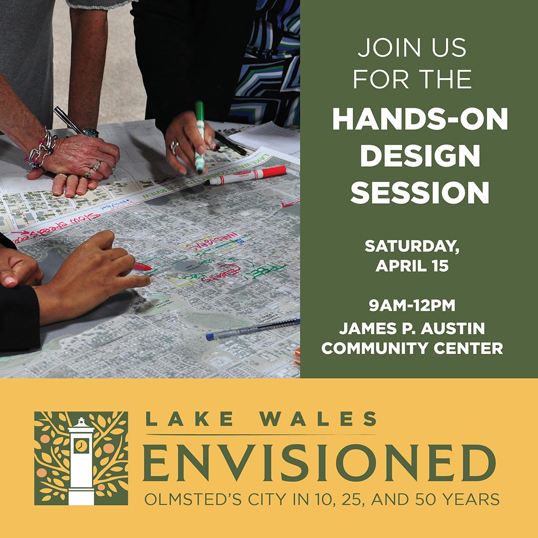 It’s time Lake Wales! TOMORROW MORNING at 9am is the Hands-on Design Session, centerpiece of the charrette week. This session will be fun, interactive, and essential to identifying common goals and gathering input! It will include a brief presentation followed by mapping and visioning exercises at tables. By marking up maps and discussing and drawing ideas, the session will help participants and the planning team dive into the details of the plan.