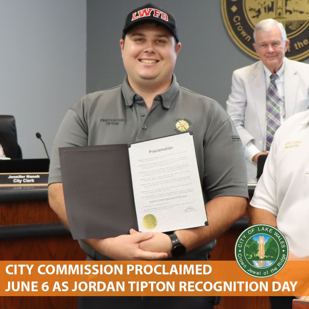 Earlier this month, City Commission proclaimed June 6 as Jordan Tipton Recognition Day, for his bravery and quick response as a Lake Wales Fire Department firefighter and paramedic.