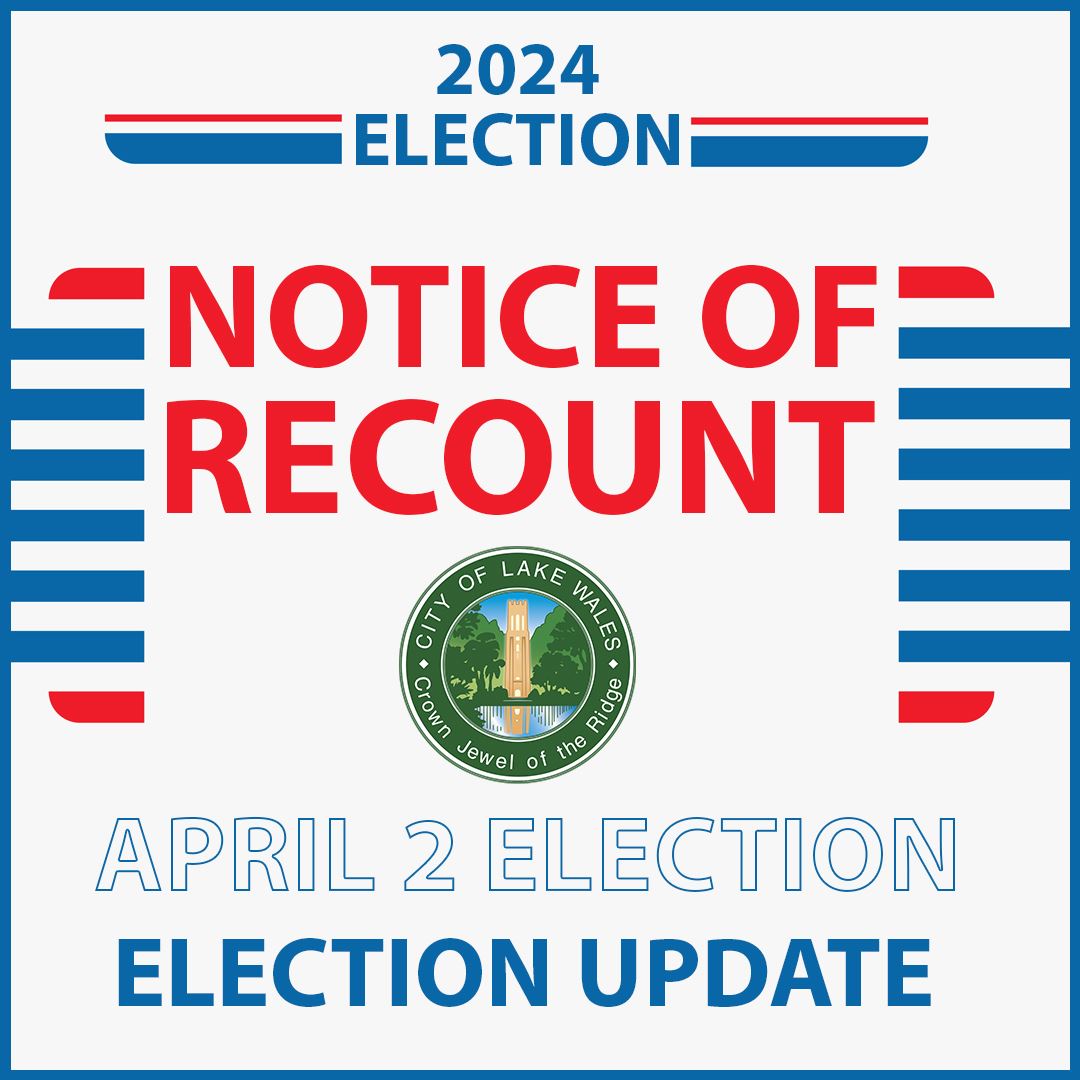 If it is determined per Florida Statute 102.141(7) that a recount is necessary for the City Commission Seat 2 race in the 2024 Lake Wales Municipal Election, the Lake Wales Canvassing Board will meet for the purpose of conducting a machine recount, which will be held at the Election Operations Center, at 70 Florida Citrus Blvd., Winter Haven, Florida on Friday, April 5, 2024 at 11:00 am.