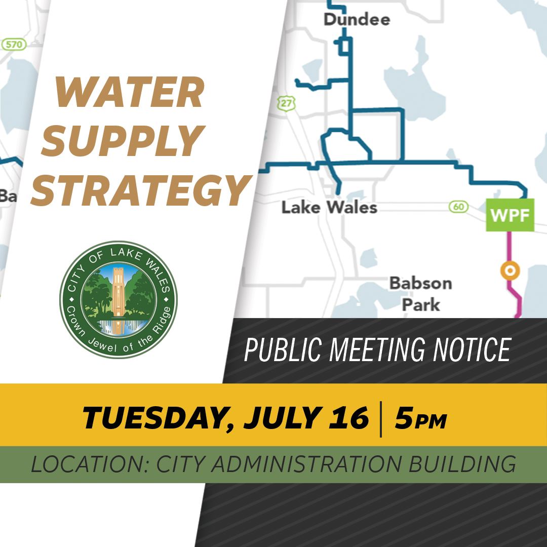 City consultant Dave Edson, P.E., with Hoyle Tanner, will provide an update on the City of Lake Wales Water Supply Strategy. Eric DeHaven, PRWC Executive Director and Mary Thomas, P.E., Carollo Engineers will report on the progress of the SEWF Alternative Water Supply project. For information about the Polk Regional Water Cooperative, click here: https://prwcwater.org
